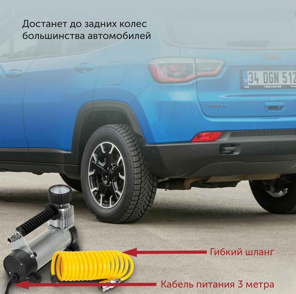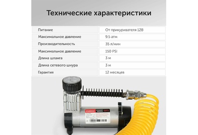 Максимальный ток потребления 15 A. Максимальное давление, атм.9.5. Напряжение питания 12 В. Производительность 35 л/мин. Подключение в прикуриватель. Длина шланга 3 м. Длина провода питания 3 м.