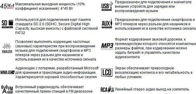 Радио. Рабочая частота: FM 87.5- 108 МГц. Количество ячеек памяти для сохранения настроенных радиостанций: 18. Промежуточная частота: 10,7 МГц. Чувствительность (30 дБ): 15 дБ. Отношение подавления помех от зеркального канала: 40 дБ. Соотношение сигнал/шум: 65 дБ. Частотная характеристика: 30 Гц-15 кГц. Проигрыватель медиафайлов. Файловая система: FAT16/FAT32. Объём флеш карты SD, USB: 32 Гб. Типы проигрываемых файлов: MP3/WMA/WAV. Отношение сигнал/шум: 85 дБ. Разделение стерео-каналов: 80 дБ. Частотная характеристика: 20Гц-20 кГц. Дополнительный вход AUX. Максимальное напряжение на входе: 1,0 В. Полное сопротивление на входе: 30 кОм. Частотная характеристика: 20 Гц-20 кГц. Разъём: мини Jack 3.5 мм. Остальное. Максимальная выходная мощность (10% коэффициент искажения): 4*45 Вт. Регулировка тембра: ±8дБ (низкие частоты 100Гц, высокие частоты 10 кГц). Импеданс динамика: 4-8 Ом/канал. RCA стерео аудиовыход. Напряжение питания: постоянный ток +11,8 – 14,4 B (на корпусе «–»). Максимальный потребляемый ток: 5 А.
