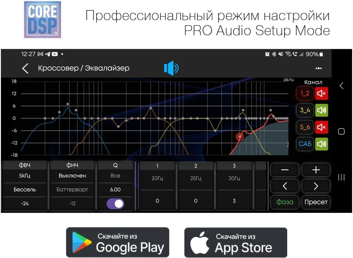 Максимальная выходная мощность: 4×141Вт Номинальная выходная мощность (при КНИ менее 1%): 4×71Вт Минимальное сопротивление динамиков: 4 Ома USB-разъём с током зарядки: до 1.2А Чтение звуковых форматов: Hi-res FLAC (24 bit/48kHz), MP3, WAV, APE, AAC RCA-выходы: 3 пары (6 каналов) Максимальная амплитуда выходного сигнала RCA: до 4 вольт ПЛАТФОРМА: Ai-DSP Поканальная временная коррекция звукового поля (Time Alignment) 31-полосный параметрический эквалайзер 6-полосный кроссовер (6-48 дБ на октаву): 1-4 каналы: HPF (ФВЧ) / LPF (ФНЧ): 20 Гц — 12,5 кГц / Отключен 5-6 каналы: HPF (ФВЧ) / LPF (ФНЧ): 10 Гц — 800 Гц / Отключен Совместимое с iOS и Android приложение Полная русификация (меню и приложение) Встроенный Bluetooth-модуль (A2DP) RGB-подсветка передней панели (16 млн. цветов) D-SWC (обучение резистивных кнопок на руле без внешнего адаптера) Пульт ДУ: в комплекте