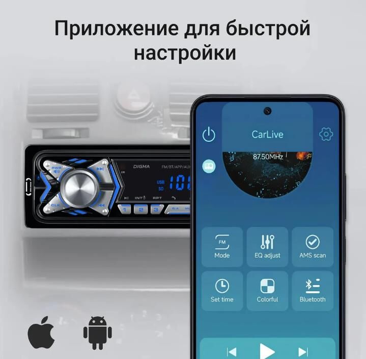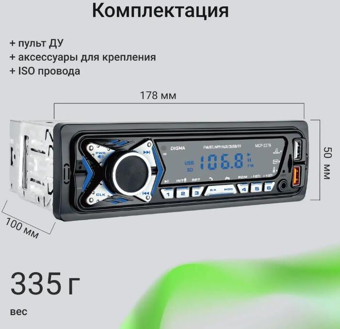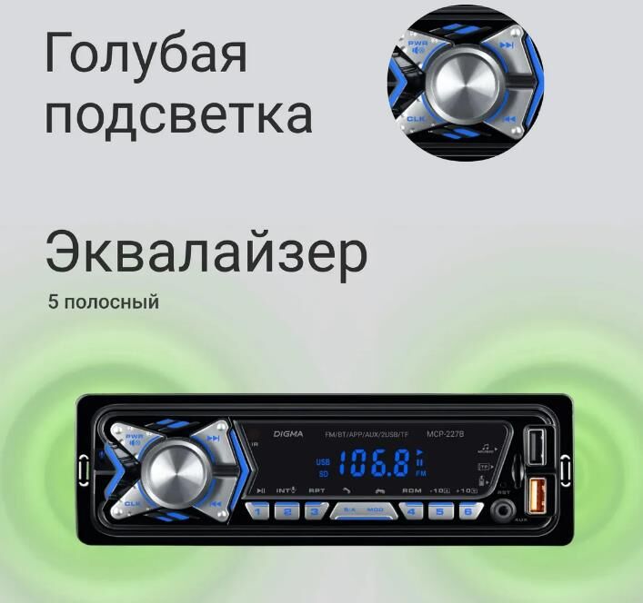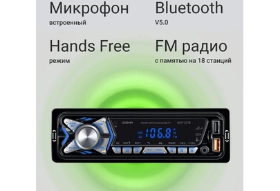 Автомагнитола DIGMA MCP-227B 1DIN 2x45Вт BT5.0 USB2.0 AUX 2 ПДУ