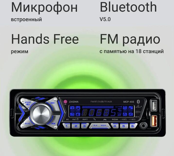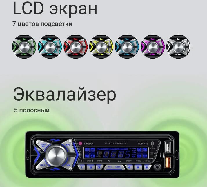 Автомагнитола DIGMA MCP-455 1DIN 4x50Вт BT5.0 USB2.0 AUX 4 ПДУ