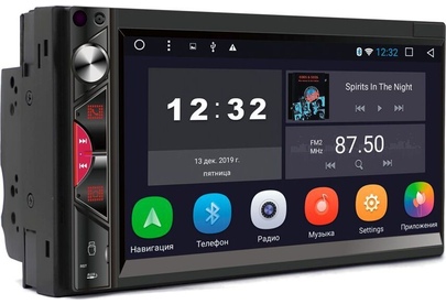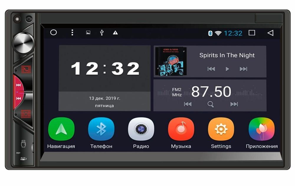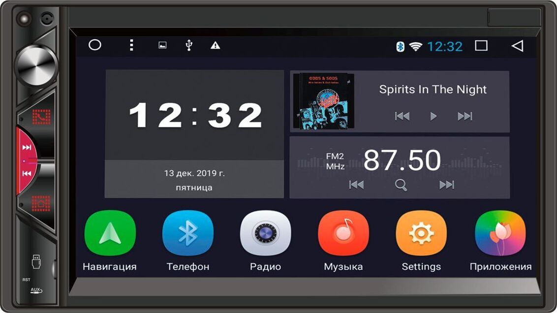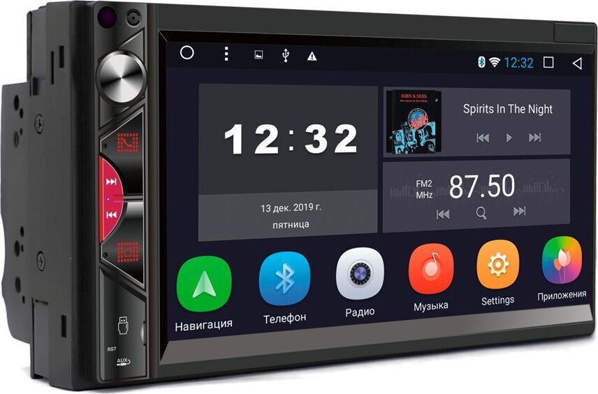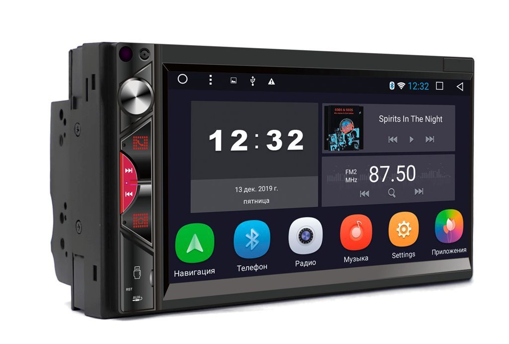 Микрофон (используется для Bluetooth) Энкодер - регулятор громкости Кнопка связи по Bluetooth, ответ на входящие вызовы Кнопка прокрутки вперед в режиме Мультимедиа/переход к следующей радиостанции в режиме Радио Кнопка прокрутки назад в режиме Мультимедиа/переход к предыдущей радиостанции в режиме Радио Menu - кнопка перехода на экран главного меню USB слот Reset - кнопка перезагрузки ресивер AUX - аудио вход Сенсорный экран ИК-приемник (для моделей с ПДУ) ОСНОВНЫЕ ФУНКЦИИ: 1. Радио 2. Музыка 3. Bluetooth 4. Видео 5. Настройки 6. Навигация 7. Часы (таймер, будильник) 8. Проводник