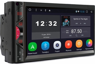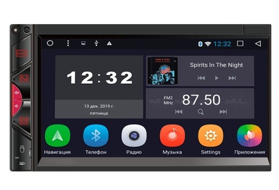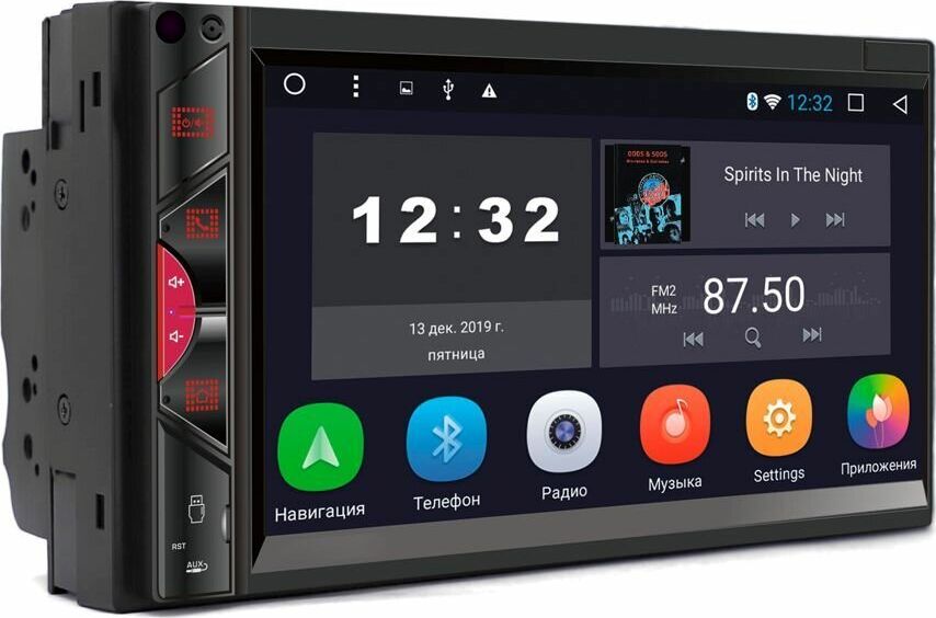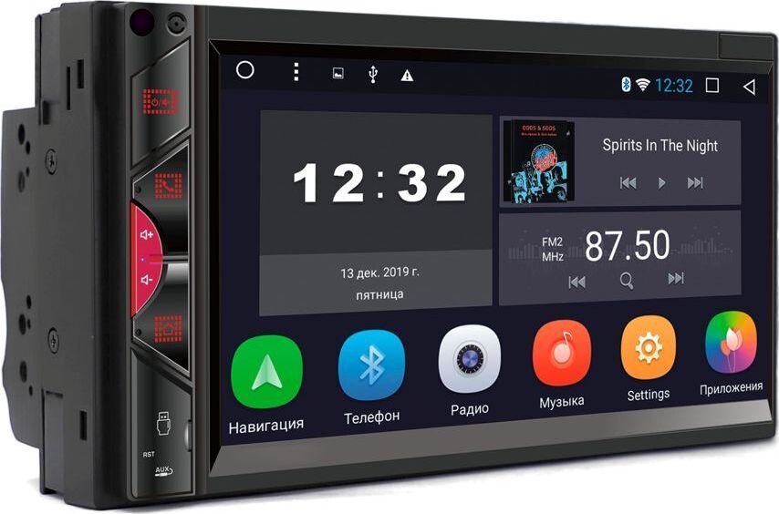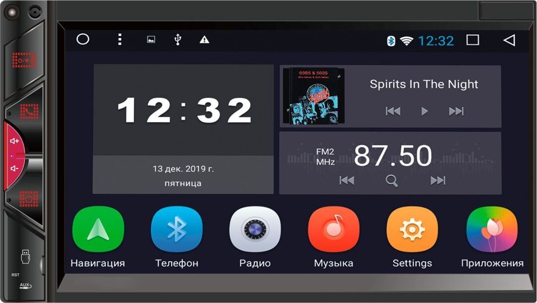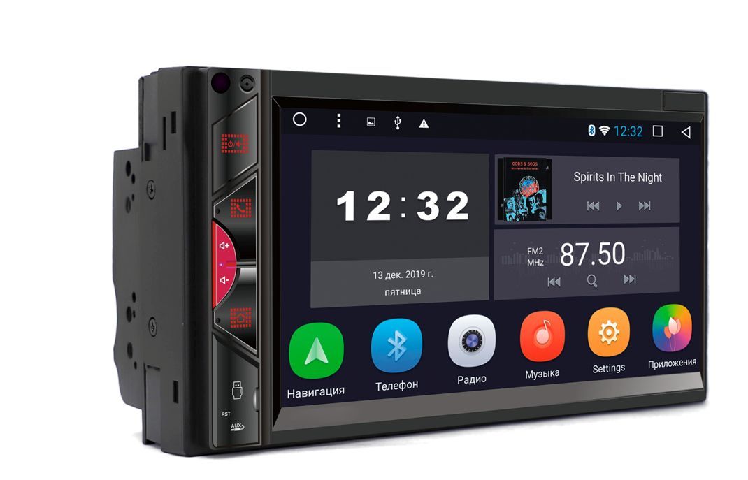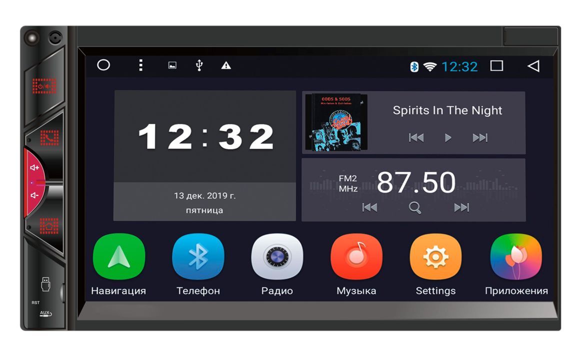 Микрофон (используется для Bluetooth) Кнопка включения/выключения ресивера/приглушения звука MUTE Кнопка связи по Bluetooth, ответ на входящие вызовы Кнопка регулировки громкости (+) Кнопка регулировки громкости (-) Menu - кнопка перехода на экран главного меню USB слот Reset - кнопка перезагрузки ресивер AUX - аудио вход Сенсорный экран ИК-приемник (для моделей с ПДУ). ОСНОВНЫЕ ФУНКЦИИ: 1. Радио 2. Музыка 3. Bluetooth 4. Видео 5. Настройки 6. Навигация 7. Часы (таймер, будильник) 8. Проводник