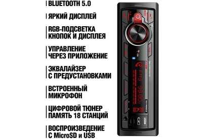 FM-радио + Воспроизведение форматов MP3 Управление из мобильного приложения Android/IOS Диапазон частот FM 87,5—108 МГц Bluetooth + (аудио, handsfree) Воспроизведение потокового аудиосигнала (A2DP) + Микрофон встроенный Максимальная выходная мощность 4 х 45 Вт Дисплей монохромный ЖК Подсветка кнопок Изменяемая RGB подсветка, 7 цветов Передняя панель фиксированная Поддержка карт памяти microSD Встроенный эквалайзер Classic, Pop, Rock, Flat Наличие USB порта + USB порт + (x2) Встроенные часы + Аудиовход AUX на передней панели Линейный RCA-выход + ISO-разъем + (с кабелем) Комплектация Ресивер, детали для установки, руководство пользователя Пульт дистанционного управления Приложение для Android/IOS Цвет черный