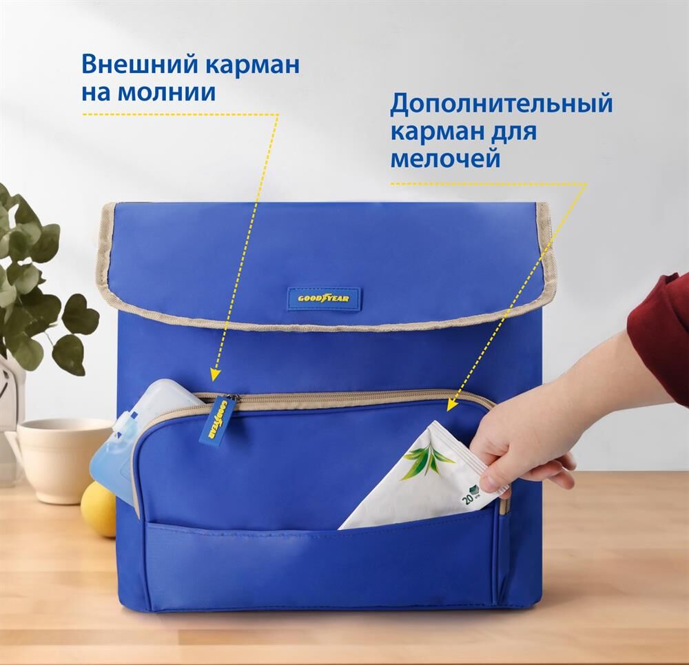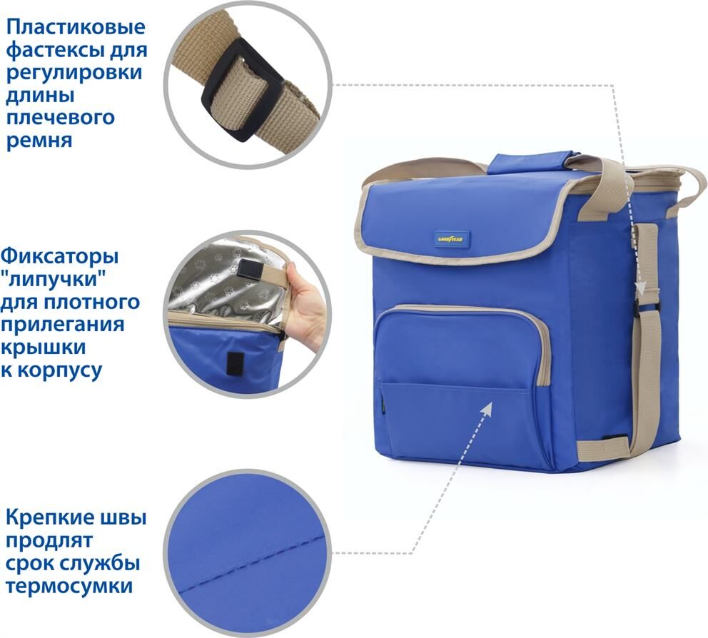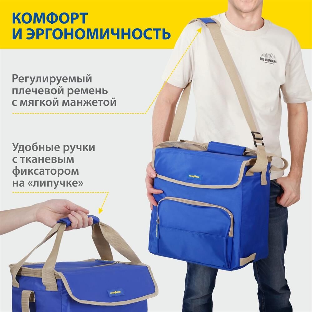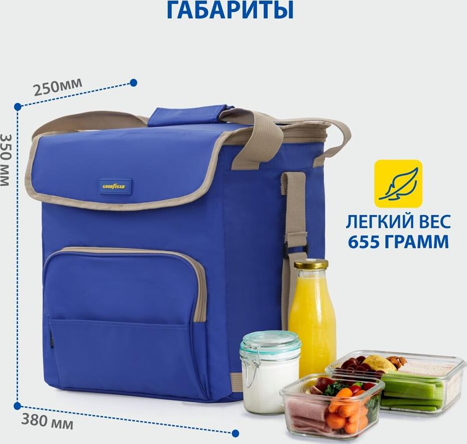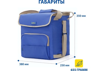 Объем 30 литров Габариты 380 х 350 х 250 мм Вес 0,65 кг Вес нагрузки 7 кг ОПИСАНИЕ ТЕХНИЧЕСКИЕ ХАРАКТЕРИСТИКИ ПРЕИМУЩЕСТВА Термосумка Goodyear поддерживает определенную температуру внутри и сохраняет свежесть продуктов в течение долгого времени. Это незаменимый помощник при транспортировке продуктов, выездов на пикник и в путешествия, для рыбалки и туризма. Термосумка поддерживает тепло или холод до 85 часов. Она сохранит свежесть и качество охлажденного или замороженного мяса, рыбы, морепродуктов, а также овощей, фруктов, прохладительных напитков и медикаментов. Кроме того, сумка-холодильник идеально подходит для поддержания температуры готовых горячих блюд и детского питания. Внутренний металлизированный слой AlFoil делает отсек для хранения герметичным и защищает сумку от протекания. Материал не впитывает запахи и его просто поддерживать в чистоте. С наружной стороны сумка-холодильник выполнена из плотной износостойкой ткани, которая не промокает и легко моется.