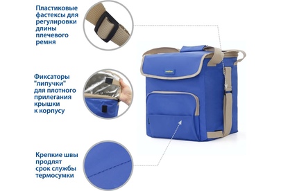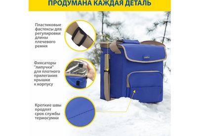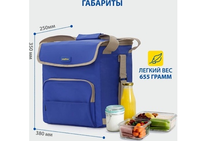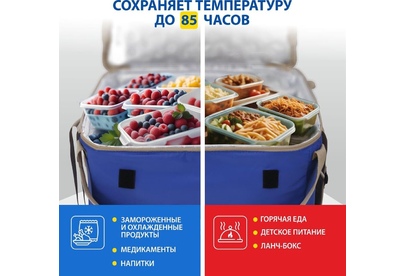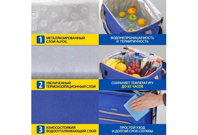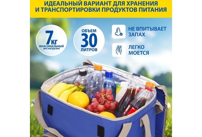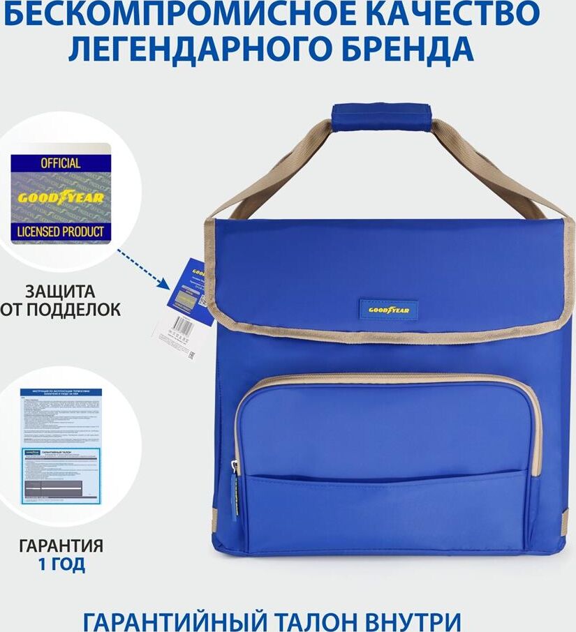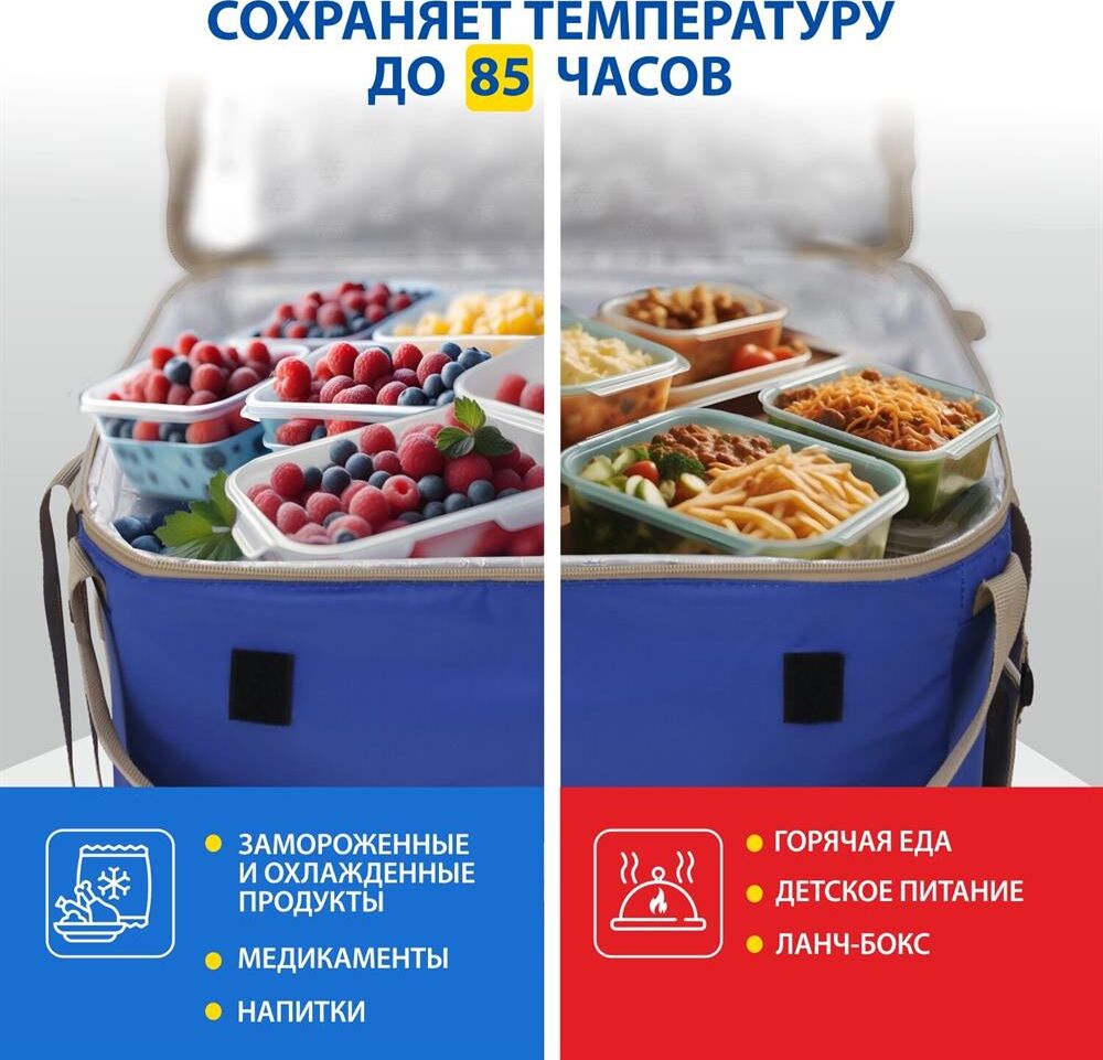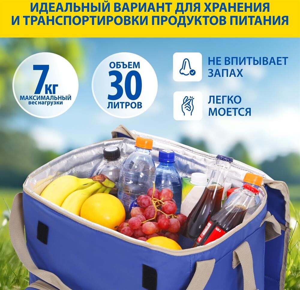 Объем 30 литров Габариты 380 х 350 х 250 мм Вес 0,65 кг Вес нагрузки 7 кг ОПИСАНИЕ ТЕХНИЧЕСКИЕ ХАРАКТЕРИСТИКИ ПРЕИМУЩЕСТВА Термосумка Goodyear поддерживает определенную температуру внутри и сохраняет свежесть продуктов в течение долгого времени. Это незаменимый помощник при транспортировке продуктов, выездов на пикник и в путешествия, для рыбалки и туризма. Термосумка поддерживает тепло или холод до 85 часов. Она сохранит свежесть и качество охлажденного или замороженного мяса, рыбы, морепродуктов, а также овощей, фруктов, прохладительных напитков и медикаментов. Кроме того, сумка-холодильник идеально подходит для поддержания температуры готовых горячих блюд и детского питания. Внутренний металлизированный слой AlFoil делает отсек для хранения герметичным и защищает сумку от протекания. Материал не впитывает запахи и его просто поддерживать в чистоте. С наружной стороны сумка-холодильник выполнена из плотной износостойкой ткани, которая не промокает и легко моется.