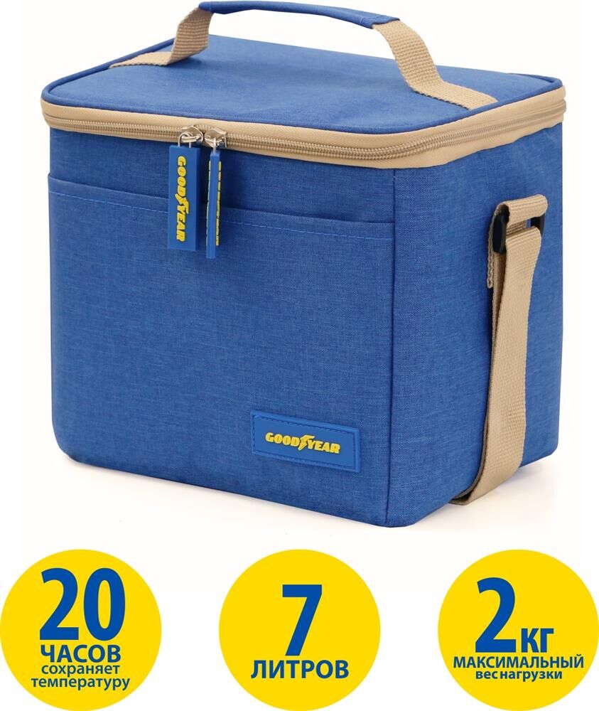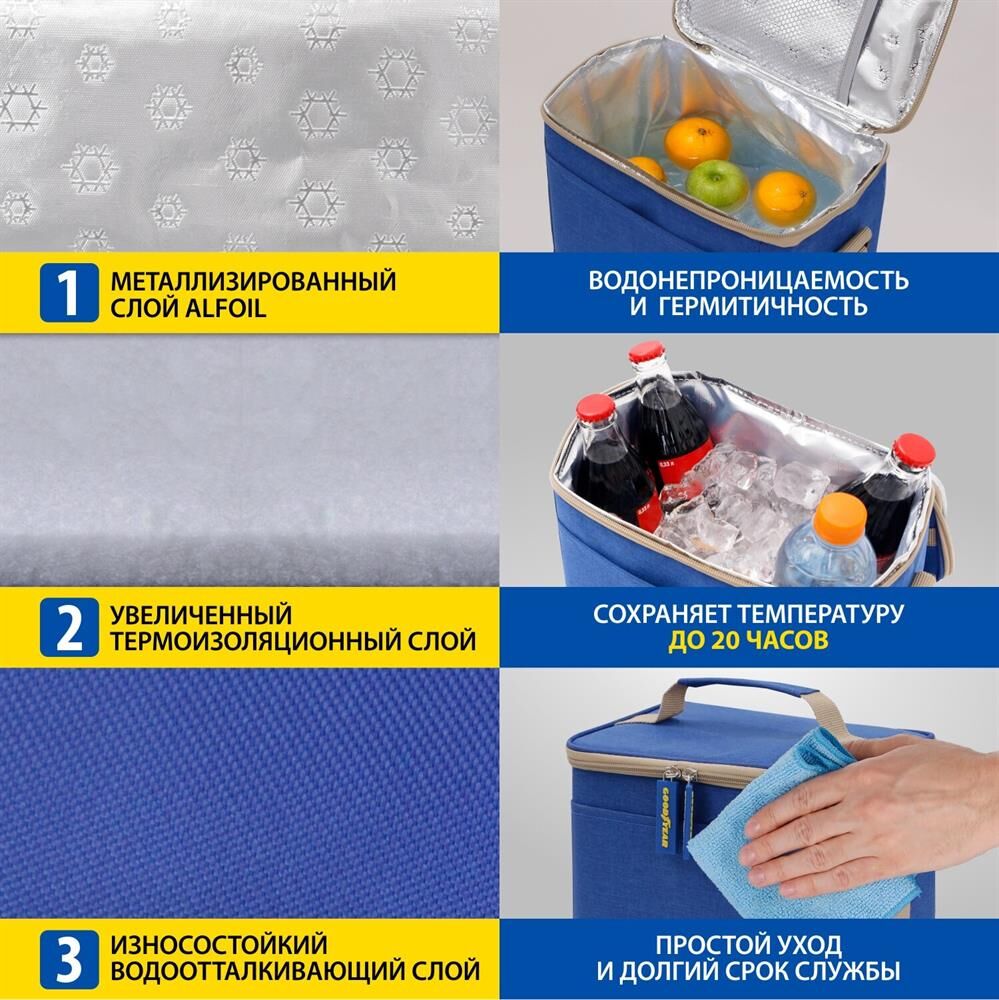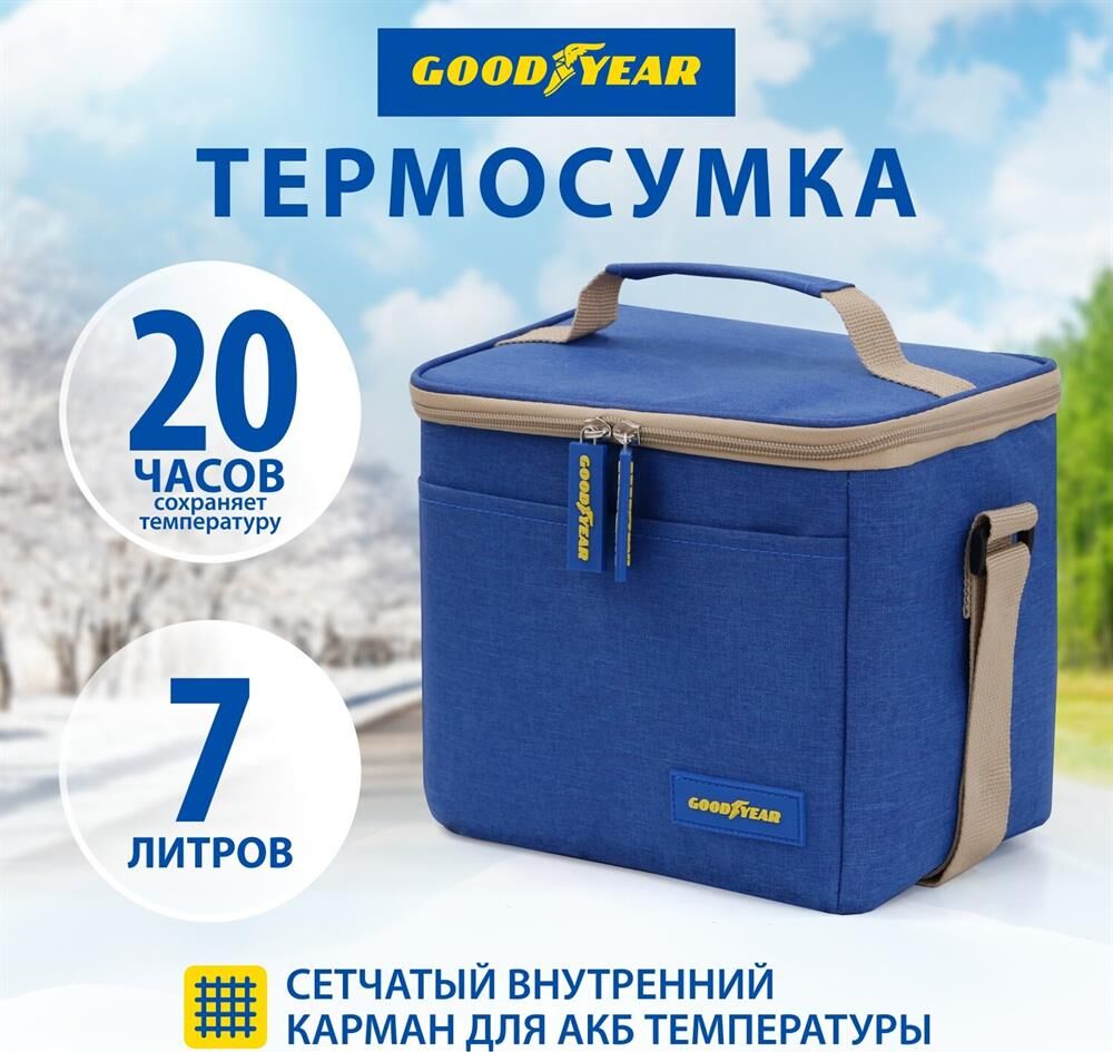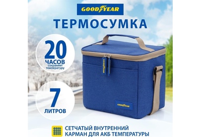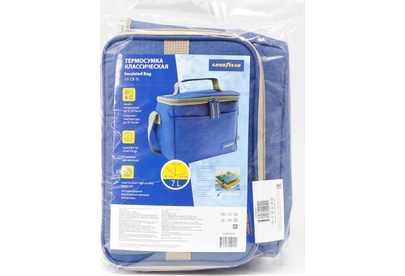 Объем 7 литров Габариты 160 х 180 х 230 мм Вес 0,27 кг Вес нагрузки 2 кг. ОПИСАНИЕ ТЕХНИЧЕСКИЕ ХАРАКТЕРИСТИКИ ПРЕИМУЩЕСТВА Термосумка Goodyear поддерживает определенную температуру внутри и сохраняет свежесть продуктов в течение долгого времени. Это незаменимый помощник при транспортировке продуктов, выездов на пикник и в путешествия, для рыбалки и туризма. Термосумка поддерживает тепло или холод до 20 часов. Она сохранит свежесть и качество охлажденного или замороженного мяса, рыбы, морепродуктов, а также овощей, фруктов, прохладительных напитков и медикаментов. Кроме того, сумка-холодильник идеально подходит для поддержания температуры готовых горячих блюд и детского питания. Внутренний металлизированный слой AlFoil делает отсек для хранения герметичным и защищает сумку от протекания. Материал не впитывает запахи и его просто поддерживать в чистоте. С наружной стороны сумка-холодильник выполнена из плотной износостойкой ткани, которая не промокает и легко моется.