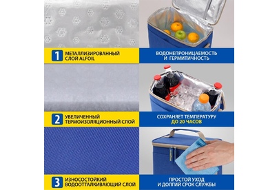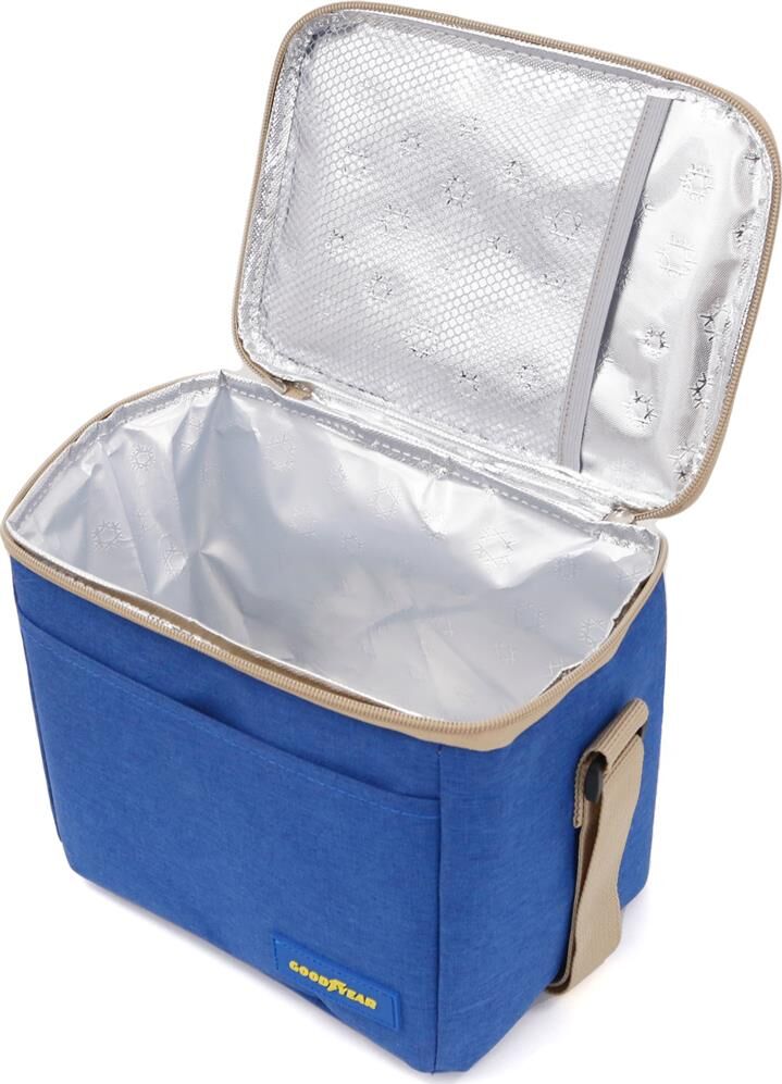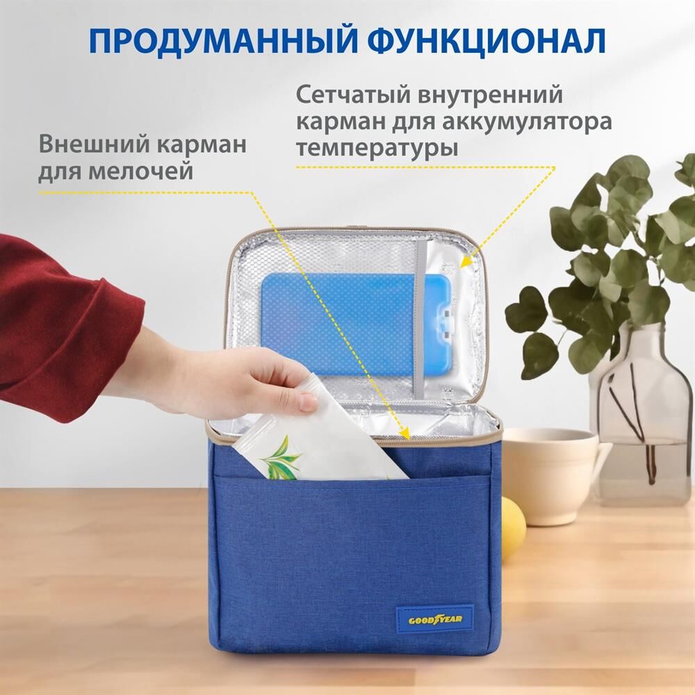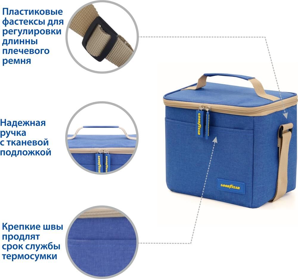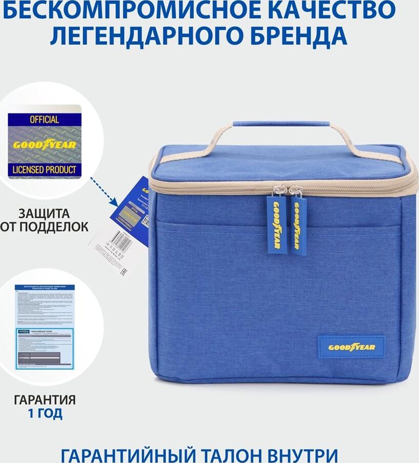 Объем 7 литров Габариты 160 х 180 х 230 мм Вес 0,27 кг Вес нагрузки 2 кг. ОПИСАНИЕ ТЕХНИЧЕСКИЕ ХАРАКТЕРИСТИКИ ПРЕИМУЩЕСТВА Термосумка Goodyear поддерживает определенную температуру внутри и сохраняет свежесть продуктов в течение долгого времени. Это незаменимый помощник при транспортировке продуктов, выездов на пикник и в путешествия, для рыбалки и туризма. Термосумка поддерживает тепло или холод до 20 часов. Она сохранит свежесть и качество охлажденного или замороженного мяса, рыбы, морепродуктов, а также овощей, фруктов, прохладительных напитков и медикаментов. Кроме того, сумка-холодильник идеально подходит для поддержания температуры готовых горячих блюд и детского питания. Внутренний металлизированный слой AlFoil делает отсек для хранения герметичным и защищает сумку от протекания. Материал не впитывает запахи и его просто поддерживать в чистоте. С наружной стороны сумка-холодильник выполнена из плотной износостойкой ткани, которая не промокает и легко моется.