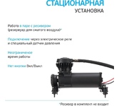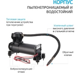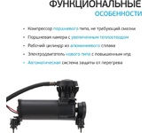 Напряжение питания: 12 В - Максимальный ток потребления: 16 A - Максимальное давление: 9 атм (BAR) - Рабочее давление пневмостистемы: 5,8 - 7,25 атм (BAR) - Максимальная производительность: 36 л/мин - Рабочая производительность: 32-28 л/мин (5,8-7,25 BAR) - Время непрерывной работы: 20 мин - Диапазон рабочих температур: -30 °C +80 °C - Уровень шума: < 85 дБ - Ёмкость ресивера: 2,85л/ 0,75 GA - Длина универсального шланга: 7,5 м - Длина провода питания: 2,4 м (сечение 10 AWG) - Плавкий защитный предохранитель: 30 A - Размеры устройства: 295 x 265 x 270 мм - Масса: 6,4 кг - Компрессор поршневого типа, не требующий смазки - Износостойкое поршневое кольцо из фторопласта PTFE - Воздушные клапаны из прочной нержавеющей стали - Обратный клапан воздушной магистрали - Рабочий цилиндр из алюминиевого сплава - Электродвигатель нового типа с повышенным КПД - Автоматическая система защиты от перегрева - Пыленепроницаемое исполнение + фильтр очистки - Ресивер - резервуар сжатого воздуха