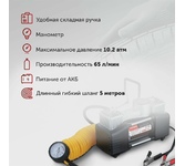 Максимальный ток потребления 23 A. Максимальное давление, атм.10.2. Напряжение питания 12 В. Производительность 65 л/мин. Подключениевстроенный аккумулятор. Длина шланга 5 м. Длина провода питания 3 м.