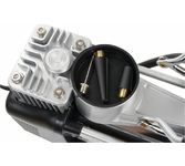 Компрессор автомобильный, металлический, усиленный, двухпоршневой, 60 л/мин, с питанием от АКБ автомобиля и функцией автостоп REXANT. Используется для накачки автомобильных шин легковых автомобилей, кроссоверов, внедорожников и малого коммерческого транспорта. Прибор оснащен мощным электрическим двигателем и повышенной системой безопасности. Устройство рассчитано на длительную эксплуатацию в суровых климатических условиях. В комплекте поставляются переходники для накачивания мячей, матрасов, резиновых лодок. Особенности: функция автостоп; встроенный LED фонарь для подсветки; двухпоршневой механизм; защита от перегрева; можно использовать для больших колес. Напряжение - 12В Номинальная сила тока - 15-25А Подключение - от аккумулятора Максимальное давление - до 10Атм Время непрерывной работы - до 20 мин. Производительность - 60л/мин Длина провода - 3м Длина шланга - 3м Компрессор автомобильный - 1 шт. Пневмошланг - 1 шт. Упаковка - 1 шт. Сумка для хранения - 1 шт. Паспорт изделия - 1 шт. Насадки - 3 шт.