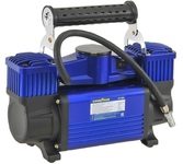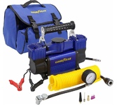 Воздушный компрессор Goodyear GY-80L 80 л/мин, двухпоршневой, питание от АКБ, съемный витой шланг, сумка для хранения Устройство отлично справляется с накачиванием колес джипов, внедорожников, минивэнов, микроавтобусов и небольших грузовиков, а также надувных лодок. В комплект входит набор переходников. Производительный компрессор питается от клемм аккумулятора 12В. Он может беспрерывно работать в течение 30 минут, а с колесом R-16 справляется за 2 минуты. Модель GY-80L оснащена съемным витым шлангом, на конце которого расположен коннектор к ниппелю колеса в виде удобной металлической защелки. За счет этого процесс присоединения компрессора становится практически мгновенным и не требует усилий. Двухпоршневой компрессор поставляется в прочной сумке, что позволяет компактно хранить инструмент в багажнике автомобиля. " Вес: 3,8 кг " Длина провода питания: 3 м " Длина витого шланга: 5 " Габариты ДхШхВ: 290х195х220 мм