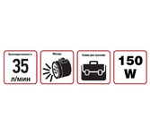 Максимальный ток потребления 15 A. Максимальное давление, атм.9.5. Напряжение питания 12 В. Производительность 35 л/мин. Подключение в прикуриватель. Длина шланга 3 м. Длина провода питания 3 м.