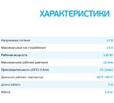 Допустимое напряжение:10-13,5 В. Максимальный ток потребления: 12 А. Максимальное давление: 7 Атм. (кг/см2). Время непрерывной работы: 30 мин. Производительность: 30 л/мин. Рабочая температура: -35°С +80°С. Масса: 2 кг Навинчивающаяся насадка на ниппель
