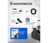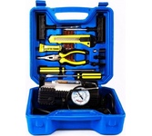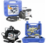 Мощность – 150 Вт. Максимальная сила тока – 15 А. Максимальное давление – до 10 кг/см2 (140PSI/10Bar) Производительность – до 35 л/мин. Шнур питания – 2,7 м. Воздушный шланг – 1 м. Пластиковый кейс для хранения и переноски Питание от гнезда прикуривателя Комплект насадок-переходников – 3 шт. Встроенный в штекер питания предохранитель Набор инструментов: плоскогубцы удлиненные – 1 шт., отвертка плоская – 1 шт., отвертка крестообразная – 1 шт., нож с выдвижным лезвием – 1 шт., спиральный рашпиль – 1 шт., шило- 1 шт., жгуты армированные – 3 шт., клей-активатор – 1 шт. Цвет- серебро Напряжение питания — 12В. Состав: металл, пластик