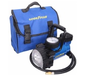 Производительность 35 л/мин, Давление до 7 атм, Для шин R13-R17, Питание 12 V, Защита флажковый предохранитель, Материал Сталь, Вес 1,9 кг, Воздушный компрессор Goodyear GY-35L LED 35 л/мин с фонарём, со съемной ручкой, сумка для хранения.