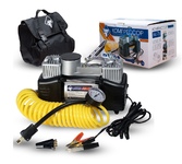 Мощность – 180 Вт. Максимальная сила тока – 15 А. Максимальное давление – до 10 кг/см2 (140PSI/10Bar) Производительность – до 75 л/мин. Шнур питания – 2,8 м. Воздушный шланг – 5м. Тканевая сумка для хранения и переноски Подключение к клеммам АКБ при помощи металлических зажимов Комплект насадок-переходников – 3 шт. Цвет- серебро Напряжение питания — 12В. Состав: металл, пластик