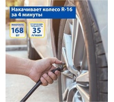Мощность - 168 Вт, Производительность - 35 л/мин, Максимальное токопотребление - 14 А, Максимальное давление - 7 Атм, Длина провода питания: 3 м, Длина воздушного шланга: 1 м. Сумка и набор переходников в комплекте.