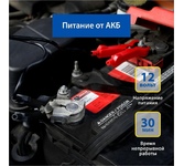 Допустимое напряжение:10-13,5 В. Максимальный ток потребления: 12 А. Максимальное давление: 7 Атм. (кг/см2). Время непрерывной работы: не более 20 мин. Производительность: 35 л/мин. Рабочая температура: -30°С +40°С. Масса: 2 кг. Навинчивающаяся насадка н