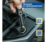 Мощность – 180 Вт. Максимальная сила тока – 20 А. Максимальное давление – до 10 кг/см2 (140PSI/10 Bar) Производительность – до 65 л/мин. Шнур питания – 2,8 м. Воздушный шланг – 5 м. Встроенный LED-фонарь Подключение к клеммам АКБ при помощи металлических зажимов Комплект насадок-переходников – 3 шт. Пластиковый кейс. Цвет- черный. Напряжение питания — 12В. Состав: металл,пластик