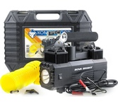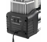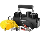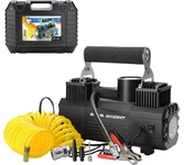 Компрессор автомобильный, металлический, усиленный, двухпоршневой, 60 л/мин, с питанием от АКБ автомобиля и функцией автостоп REXANT. Используется для накачки автомобильных шин легковых автомобилей, кроссоверов, внедорожников и малого коммерческого транспорта. Прибор оснащен мощным электрическим двигателем и повышенной системой безопасности. Устройство рассчитано на длительную эксплуатацию в суровых климатических условиях. В комплекте поставляются переходники для накачивания мячей, матрасов, резиновых лодок. Особенности: функция автостоп; встроенный LED фонарь для подсветки; двухпоршневой механизм; защита от перегрева; можно использовать для больших колес. Напряжение - 12В Номинальная сила тока - 15-25А Подключение - от аккумулятора Максимальное давление - до 10Атм Время непрерывной работы - до 20 мин. Производительность - 60л/мин Длина провода - 3м Длина шланга - 3м Компрессор автомобильный - 1 шт. Пневмошланг - 1 шт. Упаковка - 1 шт. Сумка для хранения - 1 шт. Паспорт изделия - 1 шт. Насадки - 3 шт.