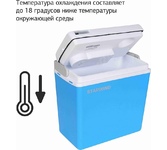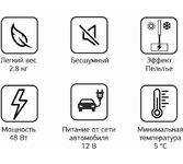 Объем камеры 23 л. Потребляемая мощность 48 Вт. Функция охлаждения. Охлаждение до5 °. Питание от бортовой сети автомобиля 12В. Материал корпуса пластик. Цвет основной синий. Ручка для переноски.