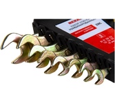 Рожковый гаечный ключ, он же гаечный с открытым зевом – это рукоятка с двумя рабочими краями, рабочая часть которых – U-образная подкова. Незаменимый универсальный инструмент для обслуживания крепежа, доступного лишь, с одной стороны. Крепеж надежно фиксируется в вилке и с помощью рычага происходит давление на откручивание или затягивание резьбового соединения. Инструменты изготавливаются из хромованадиевой стали по стандарту DIN 3110 и соответствуют требованиям ГОСТ 2838-80 и ГОСТ 10112-2001 по размерному ряду. Для вашего удобства мы собрали наиболее используемые размеры ключей в наборы. Прочный пластиковый держатель сделает хранение инструмента удобным и компактным. Размеры ключей: 8х10, 10х12, 12х13, 14х15, 13х17, 17х19 мм Покрытие: сатиновое ГОСТ 2838-80, ГОСТ 10112-2001 DIN-3118 Прочность: 47-52 HRC