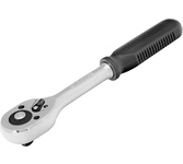 Хромированный ключ-трещотка Сибртех 14002 из стали CrV, с посадочным размером 3/8″ и 45-зубым храповым механизмом, с функцией быстрого сброса, используется для работы с резьбовым крепежом. Трещоточный механизм с 45 зубьями обеспечивает плавное вращение, облегчая работу. Инструмент пригодится дома, в мастерской и гараже. Преимущества Прочность — ключ изготовлен из закаленной хромованадиевой стали и выдерживает высокие нагрузки. Долговечность — зеркальное хромовое покрытие предотвращает образование коррозии. Эргономичность — рукоятка с нескользящей рельефной поверхностью надежно ложится в руку, поэтому работать инструментом комфортно. Функция реверса — при помощи переключателя с металлическим флажком можно одним движением изменить направление вращения трещотки. Надежная фиксация — шариковый замок крепко удерживает торцевую головку, поэтому она не соскочит во время работы. Быстрый сброс — достаточно нажать на кнопку, чтобы освободить головку от насадки, это особенно удобно для работы с крепежом разного размера.