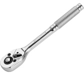 Цельнометаллический хромированный ключ-трещотка Сибртех 14014 из стали CrV, с посадочным размером 1/4″ и 45-зубым храповым механизмом, с функцией быстрого сброса, используется для монтажа и демонтажа резьбовых соединений. Предназначен для установки торцевых головок, адаптеров и удлинителей. Цельнометаллическая конструкция отличается повышенной прочностью, что позволяет работать со значительным усилием. Инструмент пригодится дома, в гараже и в поездке. Преимущества Прочность — ключ изготовлен из закаленной хромованадиевой стали и выдерживает высокие нагрузки. Долговечность — хромированная поверхность устойчива к образованию коррозии. Функция реверса — при помощи переключателя с металлическим флажком можно одним движением изменить направление вращения трещотки. Надежная фиксация — шариковый замок крепко удерживает торцевую головку, поэтому она не соскочит во время работы. Быстрый сброс — достаточно нажать на кнопку, чтобы освободить головку от насадки, это особенно удобно для работы с крепежом разного размера.