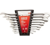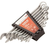 Набор Matrix 15410 включает 9 комбинированных ключей из стали CrV, размером 6-22 мм, с покрытием «матовый хром», которые пригодятся во время ремонтных работ дома или в гараже. С их помощью можно быстро монтировать и демонтировать крепежные элементы. В набор входят инструменты основных типоразмеров, позволяющие эффективно решать поставленные задачи.ПреимуществаВысокая деформационная стойкость — ключи изготовлены из хромованадиевой стали, а рабочие части закалены до твердости 45 HRC.Защита от разрушения — матовое хромоникелевое покрытие предотвращает образование коррозии.Аккуратная работа — накидные части с 12-гранным профилем охватывают всю поверхность крепежа, уменьшая риск деформации его граней.Комфортная работа в ограниченном пространстве — угол наклона кольцевых зевов относительно плоскости инструментов составляет 15°, что делает монтаж крепежа более удобным.Удобный пластиковый держатель — ключи не потеряются во время хранения и транспортировки.