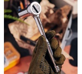 Комбинированный трещоточный ключ Matrix 14815 из стали CrV, с покрытием «зеркальный хром», размером 24 мм, позволяет быстро откручивать и закручивать болты и гайки. Рожковую часть удобно использовать там, где нет возможности полного охвата детали, а трещоточный механизм повышает удобство работы в труднодоступных местах. Преимущества Прочность — ключ из высококачественной стали 40CrV с храповым механизмом твердостью 58 HRC легко выдерживает интенсивные нагрузки. Коррозионная стойкость — зеркальное хромоникелевое покрытие защищает инструмент от воздействия влаги. Аккуратная работа — накидная часть с 12-гранным профилем полностью охватывает головку крепежа, что снижает риск деформации ее граней.