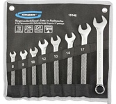 Комбинированные (рожково-накидные) ключи – самый распространённый и популярный тип гаечного ключа, сочетающий в конструкции рожковый и накидной профили. Использование двух одноразмерных профилей делает инструмент универсальным. Ключи изготовлены из легированной хромованадиевой стали в соответствии со стандартом DIN 3113 и отвечают требованиям ГОСТ 16983-80 Для вашего удобства мы собрали наиболее используемые размеры ключей в наборы. Органайзер из прочной, устойчивой к загрязнениям ткани сделает хранение инструмента удобным и компактным. Размеры ключей: 6-7-8-9-10-11-12-13-14-17-19-22 мм Покрытие: сатиновое ГОСТ 16983-80 Прочность: 47-52 HRC DIN-3113