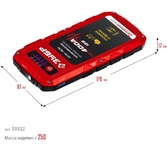 • Двигатели до 5-ти литров • Время полной зарядки аккумулятора 3 ч • Емкость аккумулятора 10000 мAч • Индикатор заряда ДА • Индикатор питания ДА • Напряжение на входе 9-5В • Подключение на выходе клеммы • Стартовый ток 400 A • Пиковый ток 600 A • Выходное напряжение 12-5B • Ток на выходе 2.1А • Максимальный ток на выходе 2.1 A • Порт USB для зарядки мобильных устройств Да • Функция компрессора / 10bar