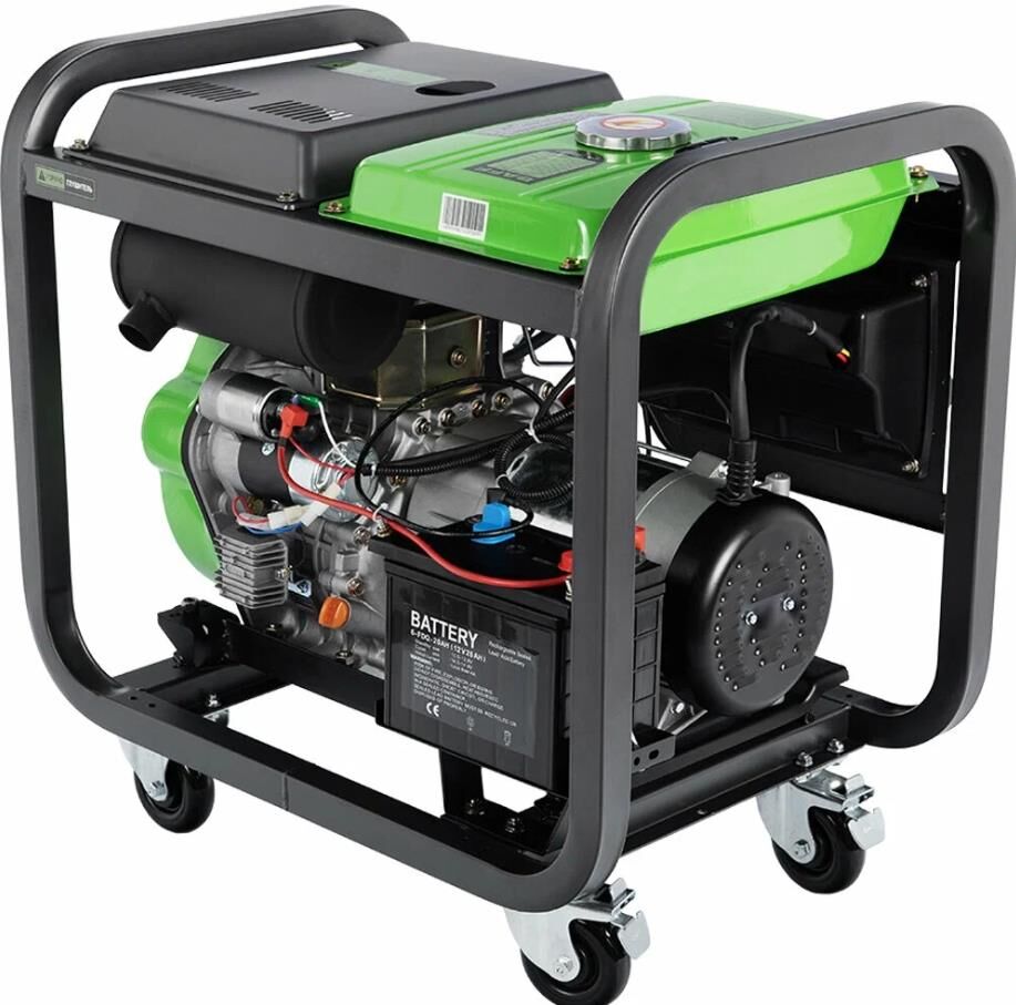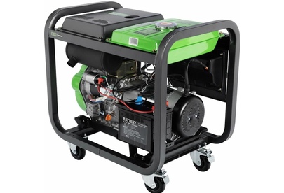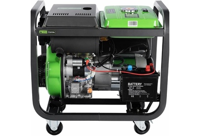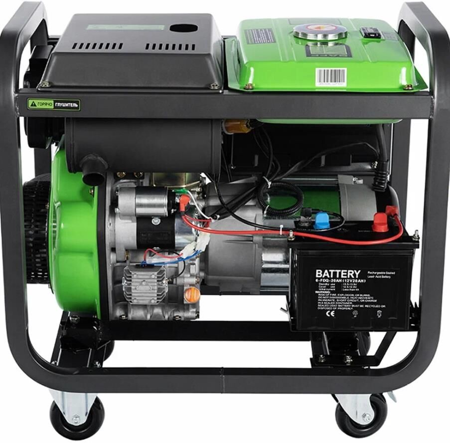 Электрогенератор дизельный с батареей, ручками и колесами, Максимальная мощность 6 кВт Номинальная мощность 5,5 кВт, Мощность двигателя 9,5 л.с., время автономной работы 6,5 ч. Тип двигателя: одноцилиндровый,вертикальный, четырехтактный, с воздушным охла