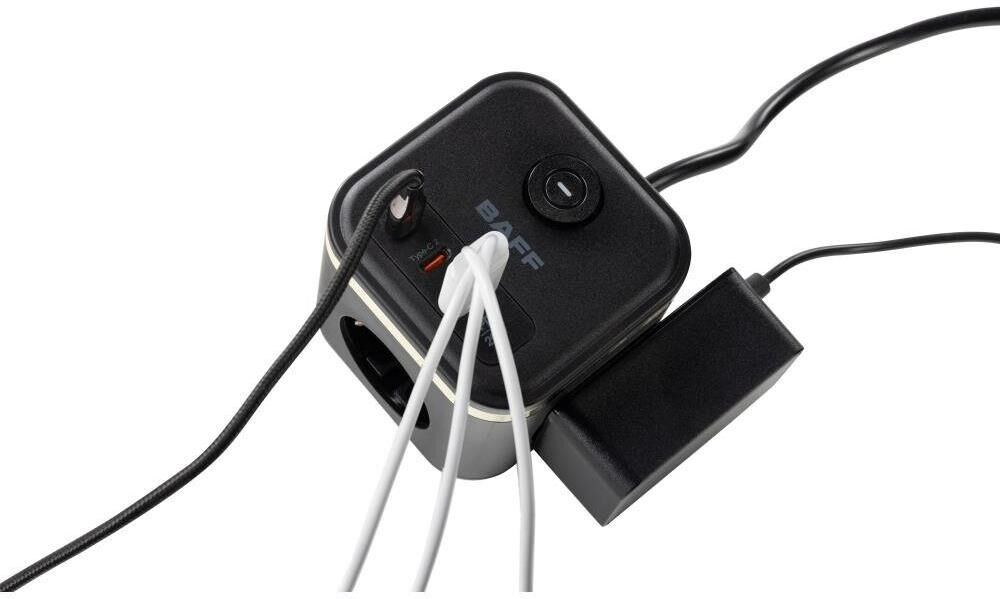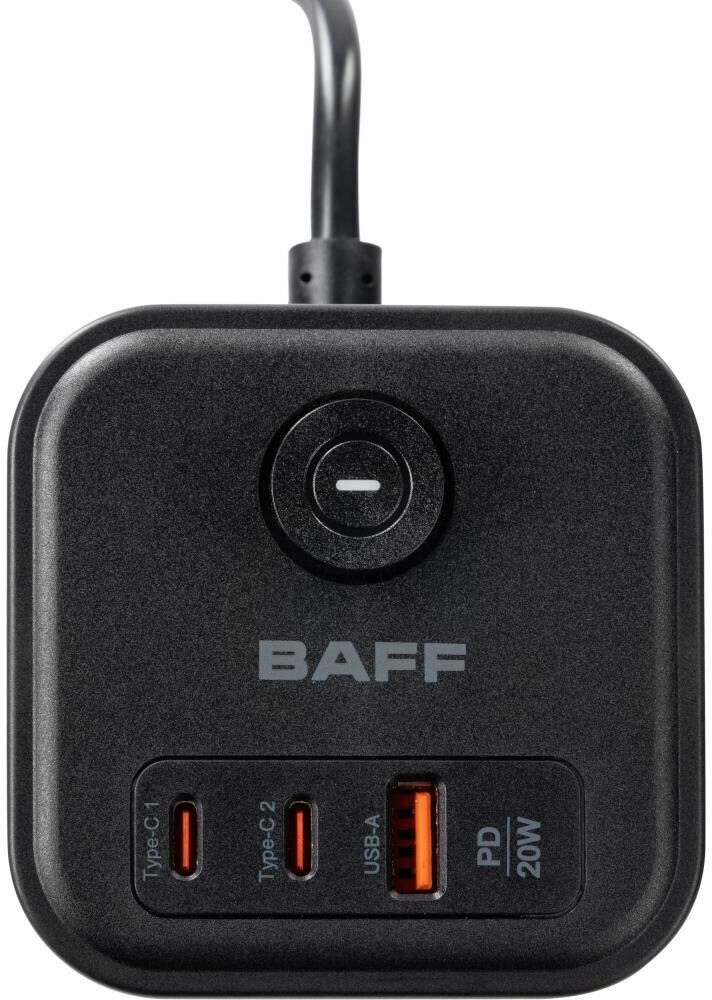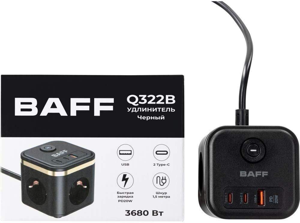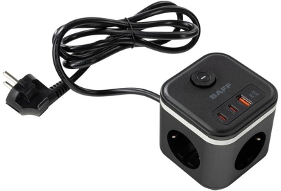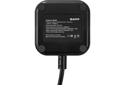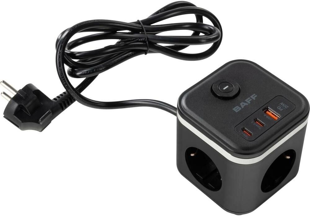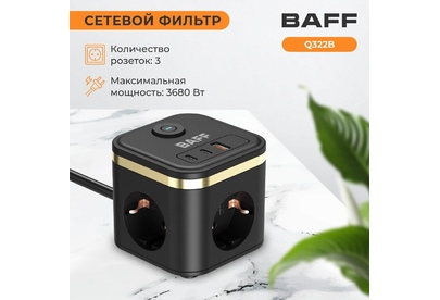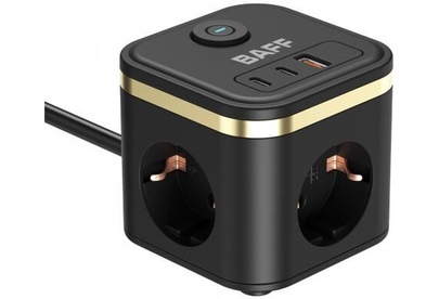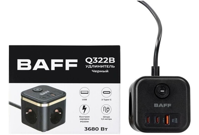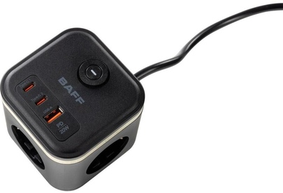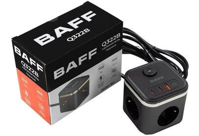 Удлинитель BAFF Q322 представляет собой устройство, предназначенное для подключения ваших устройств в местах, удалённых от стационарных розеток. Удлинитель с возможностью одновременного подключения сразу нескольких приборов оснащен тремя евророзетками переменного тока. Длина сетевого шнура составляет 1,5 метра. Сетевой фильтр имеет 2 порта Type-C (PD20) и выход USB-A, что позволяет быстро заряжать смартфон, планшет или любое другое портативное устройство.