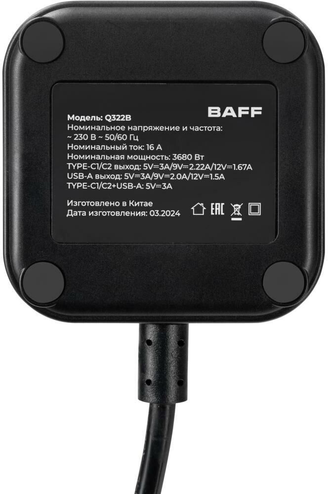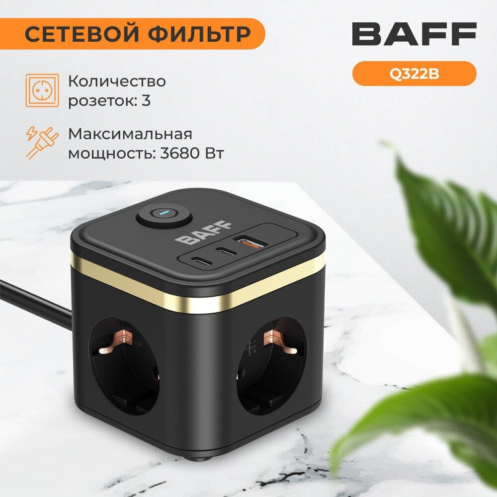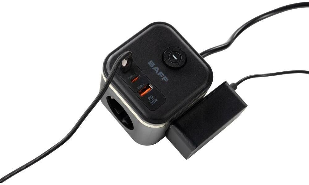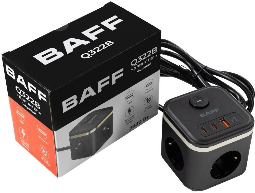 Удлинитель BAFF Q322 представляет собой устройство, предназначенное для подключения ваших устройств в местах, удалённых от стационарных розеток. Удлинитель с возможностью одновременного подключения сразу нескольких приборов оснащен тремя евророзетками переменного тока. Длина сетевого шнура составляет 1,5 метра. Сетевой фильтр имеет 2 порта Type-C (PD20) и выход USB-A, что позволяет быстро заряжать смартфон, планшет или любое другое портативное устройство.