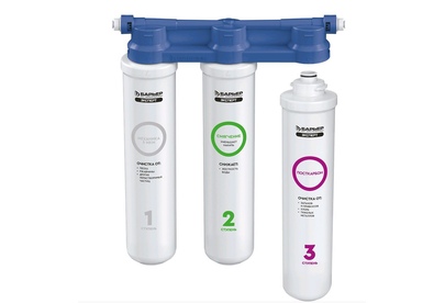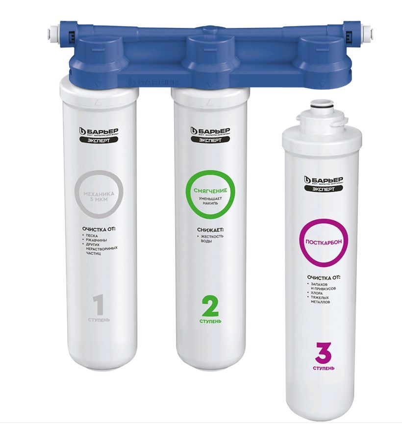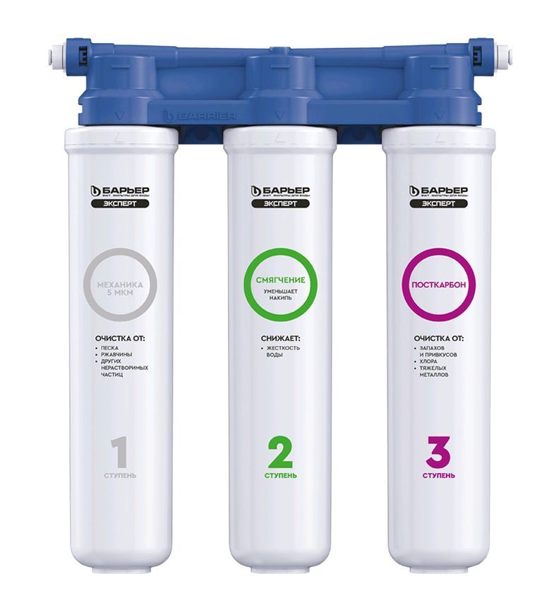 в комплекте картридж ЭКСПЕРТ Механика, картридж ЭКСПЕРТ Смягчение, картридж ЭКСПЕРТ ПостКарбон, технология SmartLock предотвращает извлечение фильтроэлемента под давлением