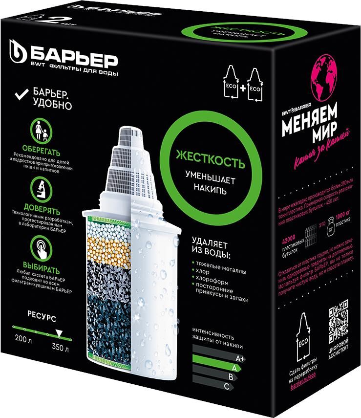 Количество в упаковке 2 Ресурс, л 350 Проблема воды Жесткая вода Тип очищаемой воды Питьевая водопроводная Срок хранения, мес 36 Размеры упаковки, ДхШхВ 129x64x146мм Срок хранения, мес 36 Вес, кг 0.3 Очищает воду от солей жесткости, которые мы привыкли встречать в жизни в виде накипи в чайнике, кофе-машине и налете на кухонном кране. Кассета БАРЬЕР Жесткость снижает образование накипи, а также удаляет основные вредные примеси, оставляя только свежую чистую воду. Ресурс каждой кассеты — 350 литров. С фильтрами БАРЬЕР вам не придется запоминать размер или диаметр сменной кассеты: любая кассета БАРЬЕР подходит ко всем фильтрам-кувшинам БАРЬЕР. А герметичное резьбовое соединение исключает попадание неочищенной воды в отфильтрованную. Ресурс зависит от качества исходной воды, но составляет не более 350 литров для каждой кассеты.