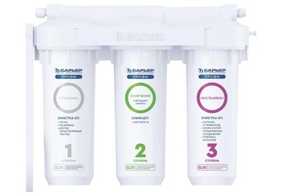 Тип: Водоочиститель. Ресурс: 10000. Картриджей в комплекте: 3. Скорость фильтрации: 2. Подключение к водопроводу: есть. Система очистки: трехступенчатая. Место установки: под раковину. Материал корпуса: пластик. Тип очистки воды: сорбционная(проточная) система. Фильтры/картириджи в комплекте: Механика 5 мкм, Смягчение, Посткарбон. Габариты упаковки (ед) ДхШхВ: 0.39x0.141x0.32. Вес упаковки (ед): 1.3. Гарантия: 12 мес.. Цвет: белый. Размеры (ШxВxГ): 363x307x130 мм. Фильтрация загрязнений: окалины, хлора. Комплектующие фильтра: кран для воды. Особенности: подключение к водопроводу. Установка: под раковину. Тип очистки: сорбционная(проточная) система, трехступенчатая. Скорость фильтрации: 2 л/мин. Ресурс картриджа: 10000 л. Комплектующие фильтра: кран для воды