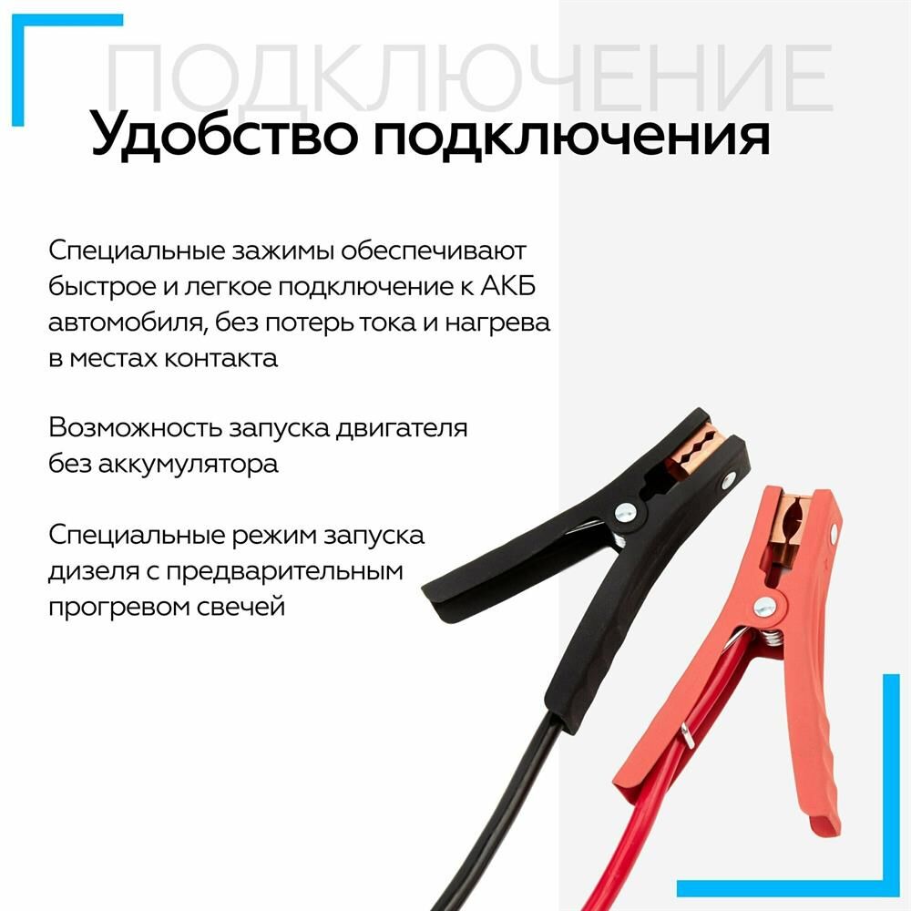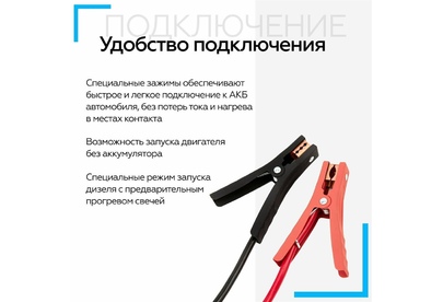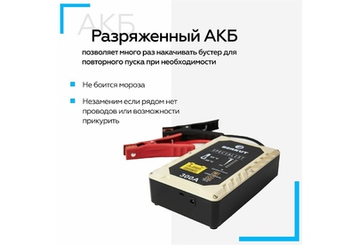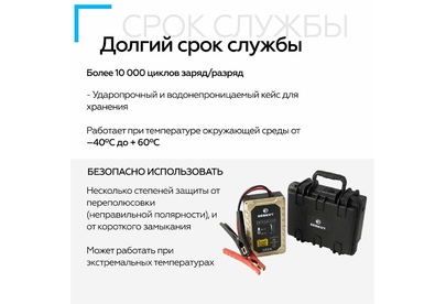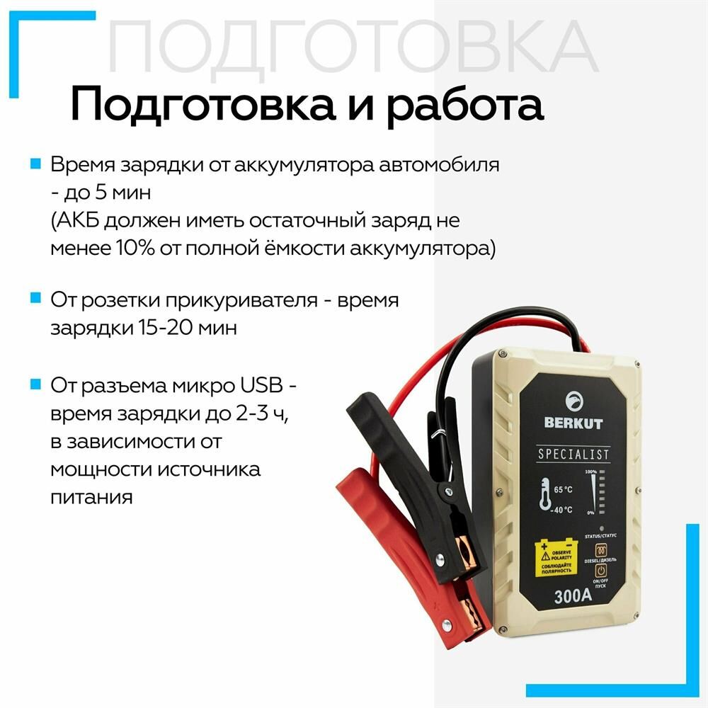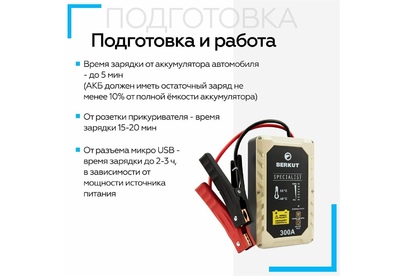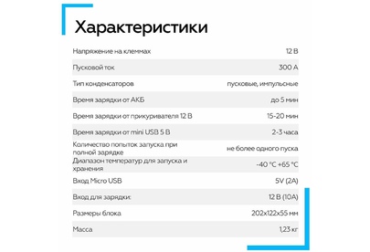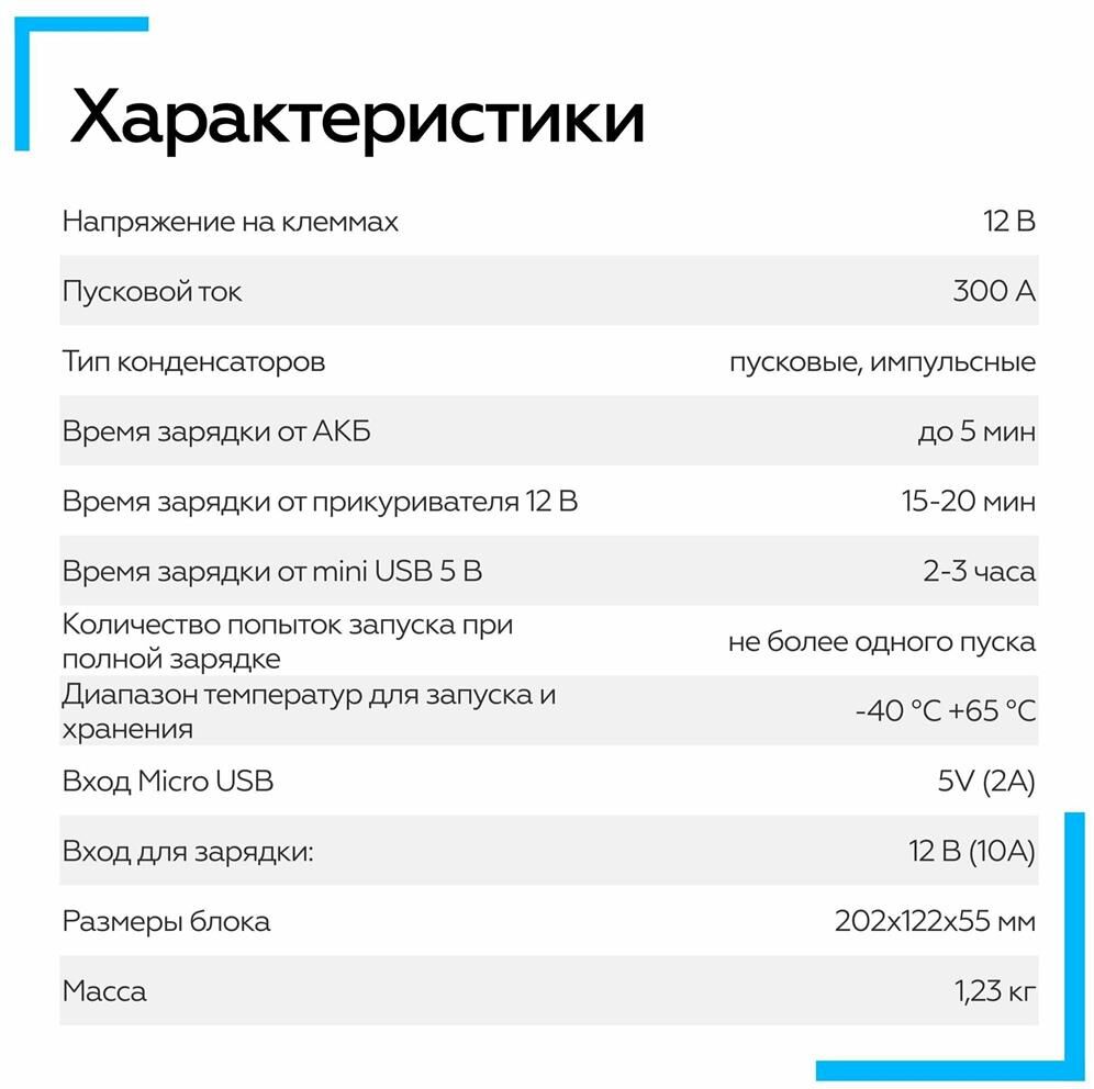 Вместо аккумуляторов применены электроконденсаторы сверхбольшой емкости (ионисторы). Время зарядки от АКБ: до 5 мин. Время зарядки от прикуривателя 12V: 15-20 мин. Время зарядки от USB 5V: 2-3 часа. Для автомобилей с бензиновыми двигателями до 3000 см. куб. и дизельными до 2500 см. куб.
