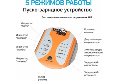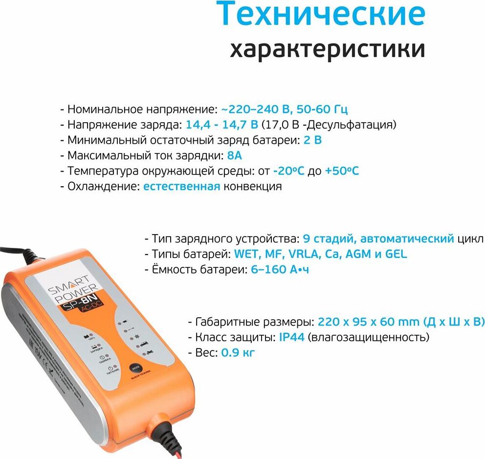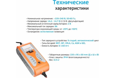 12 Вольт для аккумуляторных батарей транспортных средств 9 Стадий зарядкипоэтапная программа работы 8Aмаксимальный зарядный ток 220 Вольт подключение в бытовую сеть 5 режимов работы включая Десульфатацию и Источник питания