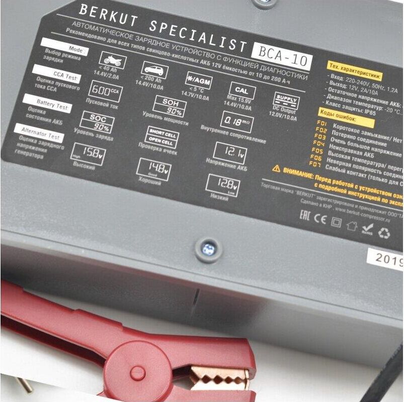 Режимы зарядки: режим "МОТО" - 14,4 V/2А режим "АВТО" - 14,4 V/10А; режим "Зимний" или AGM -14,7 V/10А; режим Ca (Кальций) - 14,4-15,9 V/10А; режим "Источник питания" - 12V/10А