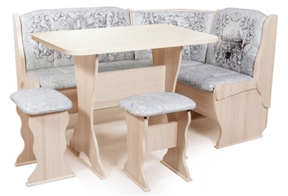 Описание: Набор мебели для кухни с шикарной фотопечатью на обивке, включающий в себя угловую скамью, стол и два табурета. В угловой скамье под сиденьями расположены два ящика. Каркас ЛДСП. Покрытие верхней части столешницы стола - термостойкий пластик, кр