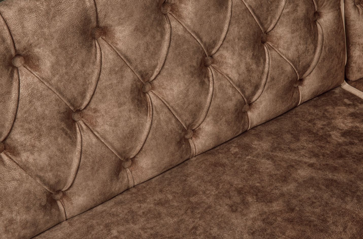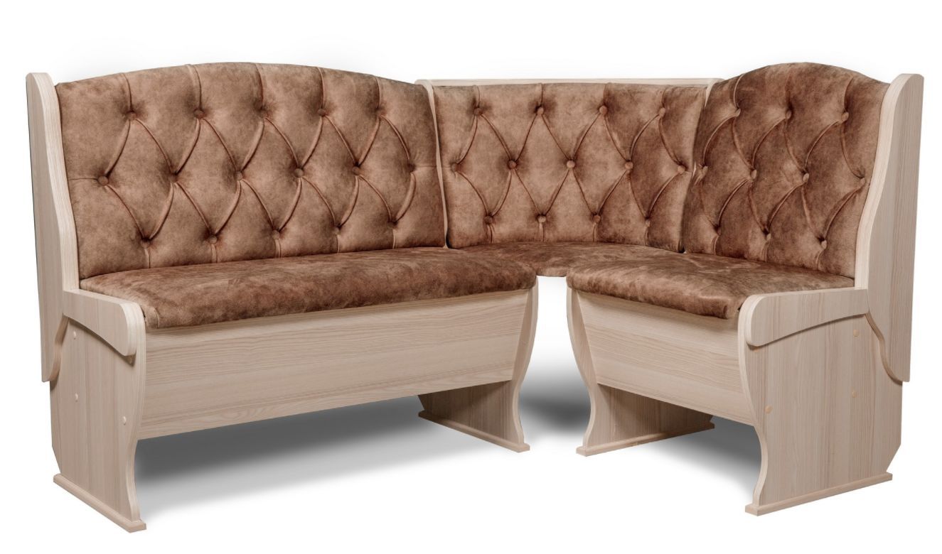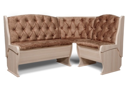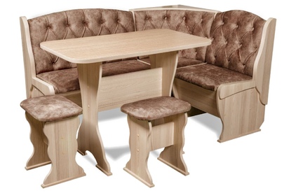 Описание: Набор мебели для кухни с классической красивой каретной стяжкой, включающий в себя угловую скамью, стол и два табурета. В угловой скамье под сиденьями расположены два ящика. Каркас ЛДСП. Покрытие верхней части столешницы стола - термостойкий пла