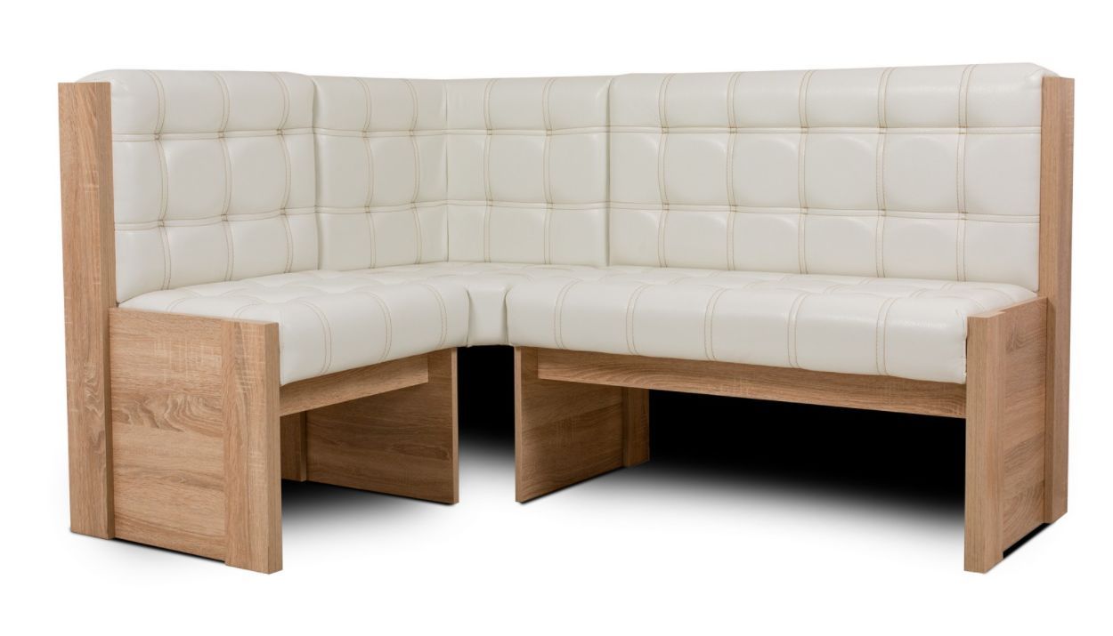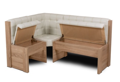 В угловой скамье под сиденьями расположены два ящика .Угловая скамья собирается как в правом ("Г"), так и в левом исполнении ("7"). Размеры: Ширина: 1500 (1100) мм. Высота: 860 мм. Глубина: 520 мм. Ящик для ханения: да. Материал: Экокожа. Наполнитель: Пенополиуретан (ППУ). Материал корпуса (каркаса): ЛДСП-16 мм.