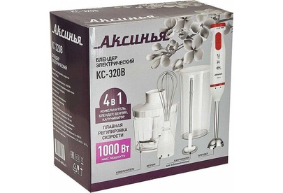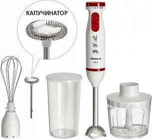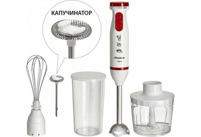 Параметры Максимальная мощность 1000 Вт Номинальная потребляемая мощность 600 Вт Объем чаши измельчителя 500 мл Объем мерного стакана 700 мл Описание Блендер электрический предназначен для смешивания, измельчения и взбивания продуктов и жидкостей в бытовых и аналогичных условиях Цвет: белый с красным Насадка и нож из нержавеющей стали Специальная заточка ножей Мерный стакан с крышкой Четыре сменные насадки: капучинатор из нержавеющей стали для приготовления молочной пенки, используемой для кофе измельчитель для измельчения орехов, трав, яиц, мяса, сыра, лука, рыбы, хлеба, чеснока, овощей и т.п. насадка для измельчения и смешивания для работы с мягкими и жидкими продуктами (приготовление соусов, супов, майонеза, детского питания, пюре, всех видов коктейлей и т.п.) венчик для взбивания яичных белков, сливок, смешивания жидких продуктов, замешивания жидкого теста Плавная регулировка скорости Режим «ТУРБО» Упаковка: цветная коробка
