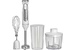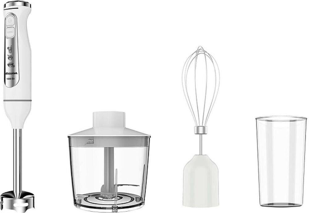 Параметры Максимальная мощность 1500 Вт Номинальная потребляемая мощность 600 Вт Объем чаши измельчителя 500 мл Объем мерного стакана 700 мл Описание Блендер электрический предназначен для смешивания, измельчения и взбивания продуктов и жидкостей в бытовых и аналогичных условиях Ножи из нержавеющей стали Три сменные насадки: насадка для смешивания венчик для взбивания измельчитель Мерный стакан Противоскользящие ножки чаши измельчителя Плавная регулировка скорости Режим «ТУРБО» Цвет: белый Упаковка: цветная коробка