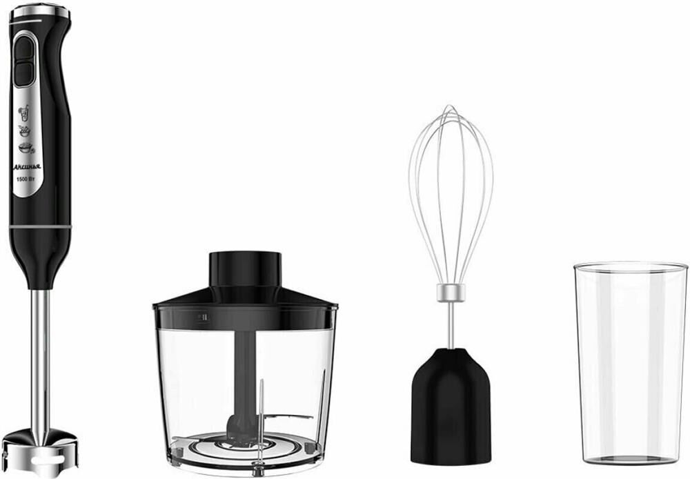 Параметры Максимальная мощность 1500 Вт Номинальная потребляемая мощность 600 Вт Объем чаши измельчителя 500 мл Объем мерного стакана 700 мл Описание Блендер электрический предназначен для смешивания, измельчения и взбивания продуктов и жидкостей в бытовых и аналогичных условиях Ножи из нержавеющей стали Три сменные насадки: насадка для смешивания венчик для взбивания измельчитель Мерный стакан Противоскользящие ножки чаши измельчителя Плавная регулировка скорости Режим «ТУРБО» Цвет: черный Упаковка: цветная коробка