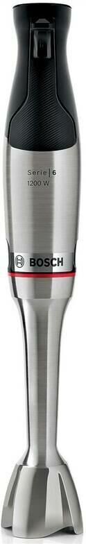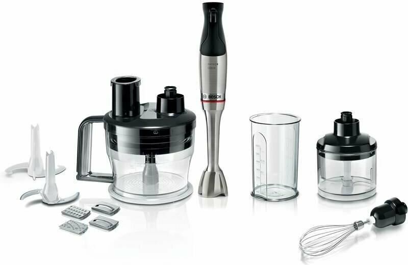 Блендер погружной, мощность 1200 Вт, материал корпуса: металл, материал погружной части: нержавеющая сталь, импульсный режим, защита от перегрева, в комплекте: венчик; измельчитель; крюк для замешивания теста; насадка-шинковка