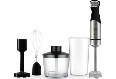 Максимальная мощность 1000 Вт Погружная часть и лезвия из нержавеющей стали Корпус из пластика, декорирован нержавеющей сталью Плавная регулировка скорости 5 скоростей Турборежим Скорость вращения: 15000 об/мин 20% Насадка венчик для взбивания Стакан для смешивания 700 мл Насадка блендер для измельчения и смешивания Насадка измельчитель объёмом 500 мл Насадка для приготовления пюре Длина шнура 1,2 м Электропитание 220 240 В, 50 60 Гц